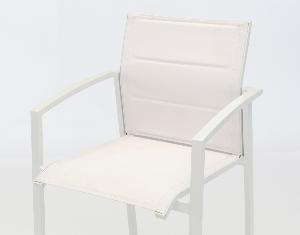 Colección fabricada en aluminio de alta calidad con Estructura en aluminio lacado en blanco. Asiento y respaldo en textilene a doble pared relleno con espuma dryfoam para un mayor confort. Apilable.. Perfecta para un patio, jardín o terraza. También apta para uso comercial en un café, bar o restaurante.