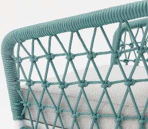 Colección fabricada en aluminio de alta calidad combinado con cuerda náutica de 6mm. Cojin de asiento y respaldo (8cm) en tejido waterproff. Perfecta para un patio, jardín o terraza. También apta para uso comercial en un café, bar o restaurante.